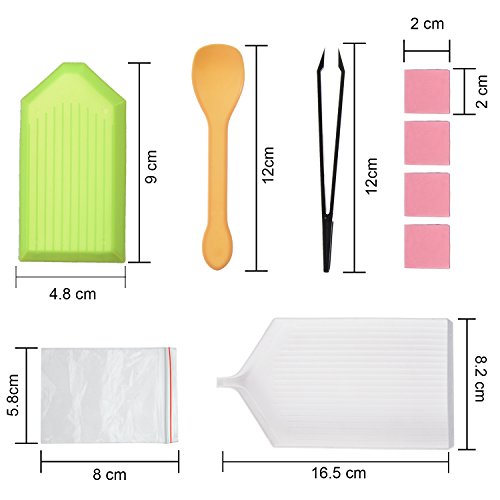 - Diamond painting tools set: 6 x diamond sticky pen in 3 different types, 4 x glue, 3 x plastic plates (2 pieces small one and 1 piece big one), 1 x tweezer, 20 x bags, 1 x spoon, 1 x diamond embroidery box, 2 x labels, 38 pieces in total