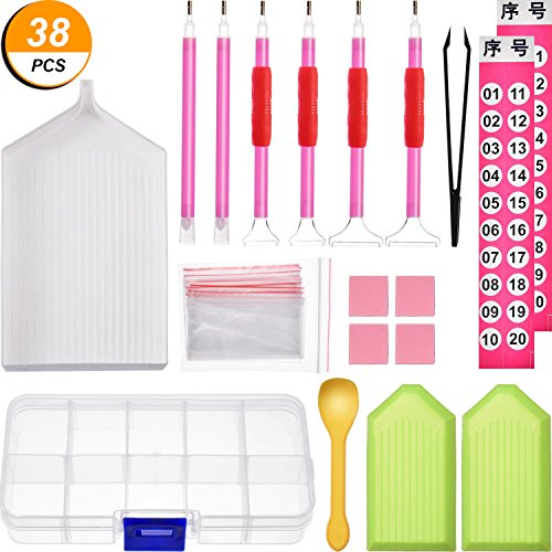 Hestya Diamond Painting Tools Kits Diamond Stitch Accessories with Pen, Tweezers, Glue, Plastic Tray, Diamond Embroidery Box and Bags, Labels, Spoons for Diamond Embroidery, Totally 38 Pieces