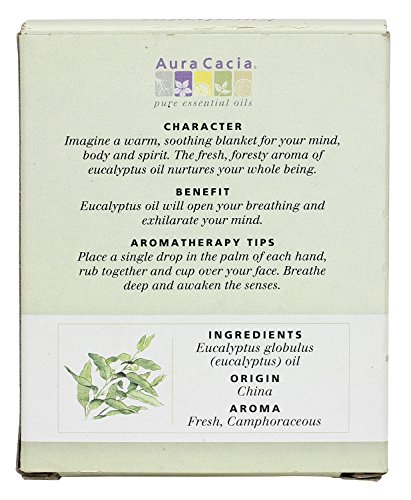 -. Binding : Health and Beauty -. Brand : Aura Cacia -. Color : Eucalyptus -. Feature : 100% Pure essential oil / Refreshes the body / Invigorates the mind / Purifies the spirit / Can be used in a lamp ring diffuser -. IsAdultProduct : 0 -. Label : Aura Cacia -. Manufacturer : Aura Cacia -. PackageQuantity : 1 -. ProductGroup : Beauty -. ProductTypeName : BEAUTY -. Publisher : Aura Cacia -. Studio : Aura Cacia -. Title : Aura Cacia Pure Essential Oil