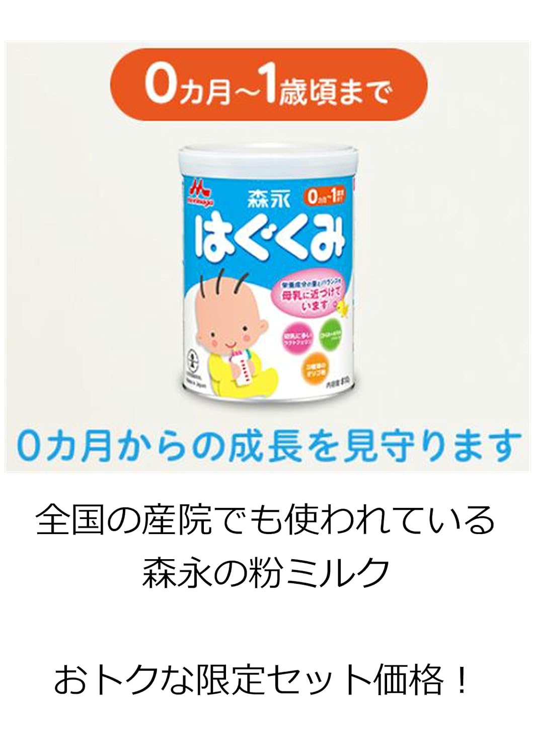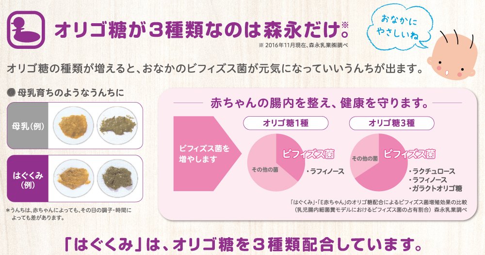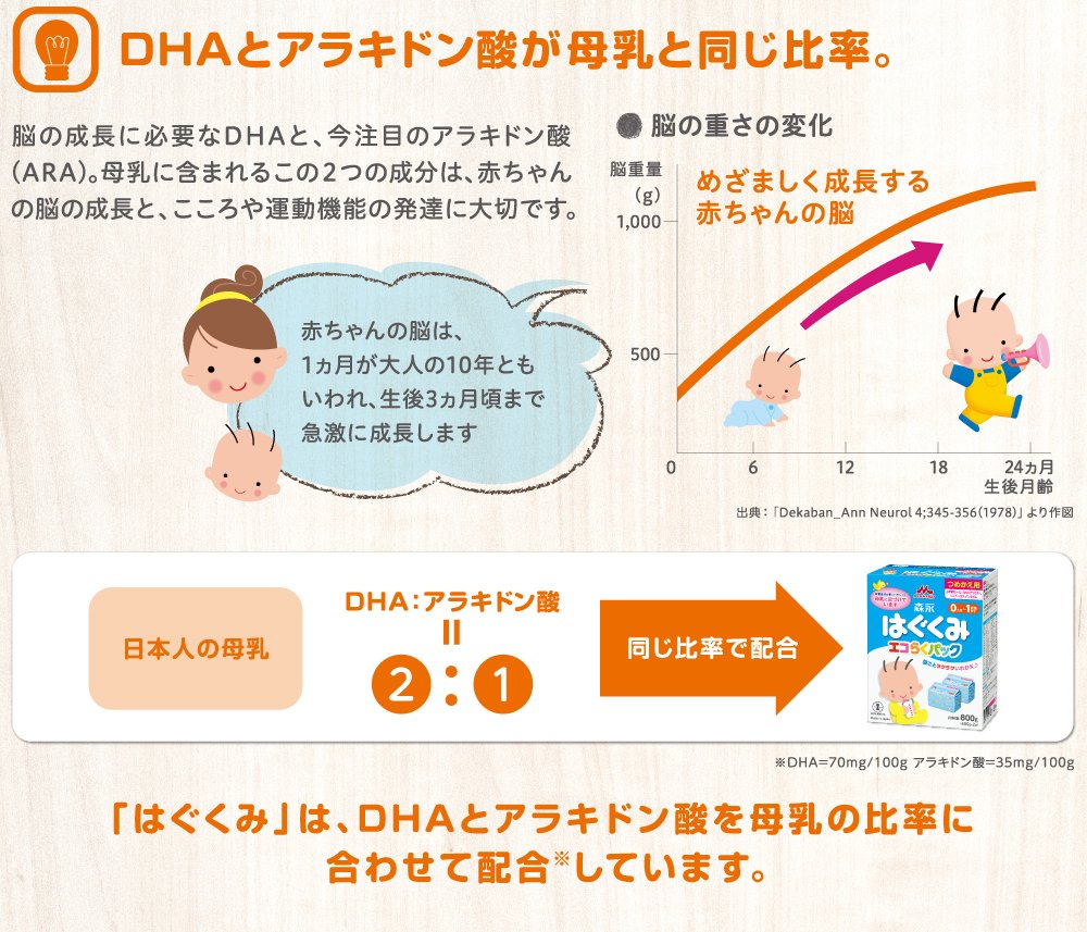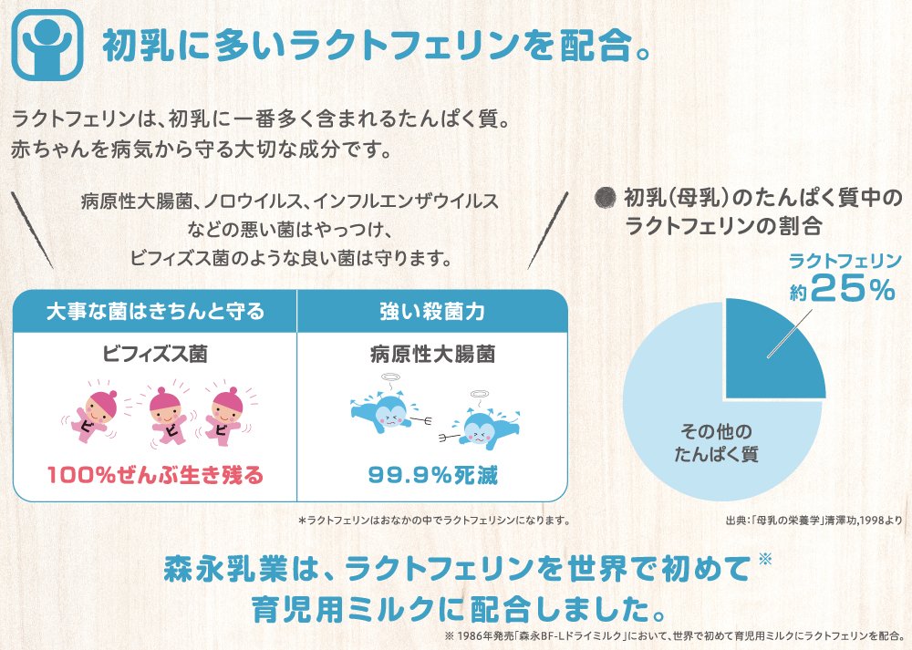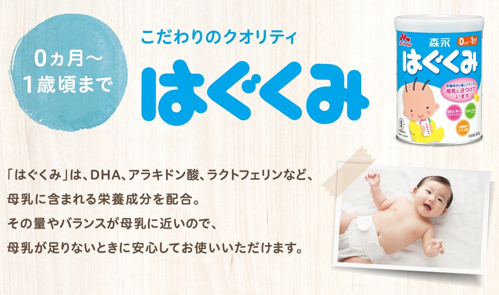 原材料:ホエイパウダー(乳清たんぱく質)、調整脂肪(パーム核油、パーム油、大豆油、エゴマ油)、乳糖、脱脂粉乳、乳清たんぱく質消化物、デキストリン、バターミルクパウダー、乳糖分解液(ラクチュロース)、カゼイン、ガラクトオリゴ糖液糖、ラフィノース、精製魚油、アラキドン酸含有油、カゼイン消化物、食塩、酵母、L-カルニチン、炭酸カルシウム、レシチン、塩化マグネシウム、炭酸カリウム、ビタミンC、ラクトフェリン、クエン酸三ナトリウム、リン酸水素二カリウム、コレステロール、塩化カルシウム、イノシトール、ピロリン酸第二鉄、ビタミンE、タウリン、硫酸亜鉛、シチジル酸ナトリウム、ビタミンD3、パントテン酸カルシウム、ニコチン酸アミド、ウリジル酸ナトリウム、ビタミンA、硫酸銅、5'-アデニル酸、イノシン酸ナトリウム、グアニル酸ナトリウム、ビタミンB6、ビタミンB1、葉酸、β-カロテン、ビオチン、ビタミンB12