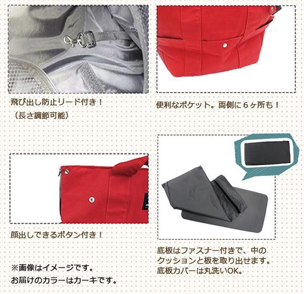 | 肩紐70cmのゆったりサイズ!!ファスナー部分はメッシュ窓になっております。小物を入れられるポケットがバッグ両側に6か所付いており、外出時にとっても便利です♪長さ調節可能な飛び出し防止リードや、バッグ横から顔出しできるボタン付きなど多機能性!!底板はファスナー付きで、中のクッション・板を取り出すことができます。底板カバーは丸洗いOK。 |