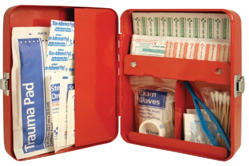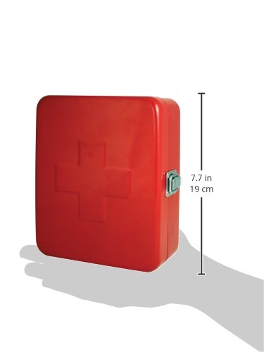 Create your own first aid kit with this classic designed first aid box. Inside compartments will keep your essential items orgainized. Red painted steel with a chrome latch. Can be wall mounted or carried. Measures 6 x 7. 5 x 3-inches. First aid supplies not included.Feature