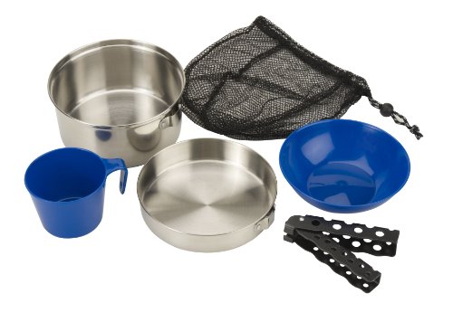 ReleaseDate : 2012-01-01 Studio : Coleman Publisher : Coleman Binding : Sports Product Description The Coleman 1-Person Stainless Steel Mess Kit has everything you need for cooking and eating on the trail, at camp, and beyond. For cooking, you get a 6.25" frying pan with dual-use lid (use it as a lid or as a second pan), a 2-quart cooking pot, and a pan gripper, all made of rugged #304-grade stainless steel. For eating, there's a 6" bowl and 12-ounce mug, both made of BPA-free polypropylene and both conveniently dishwasher-safe. Everything nests together compactly, for easy packing and transport, in the included mesh carry bag. 0