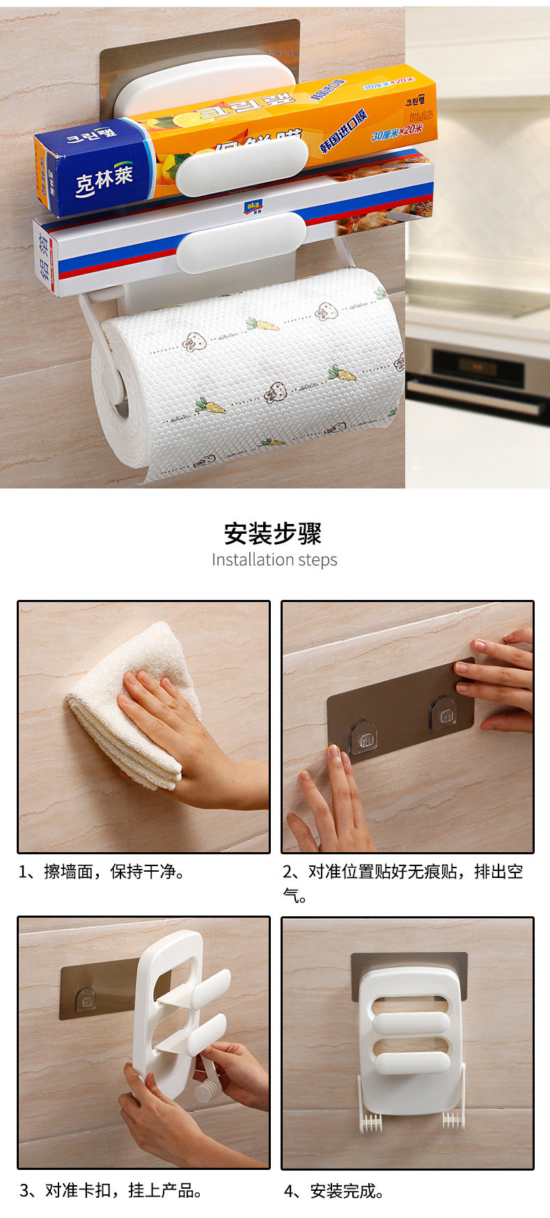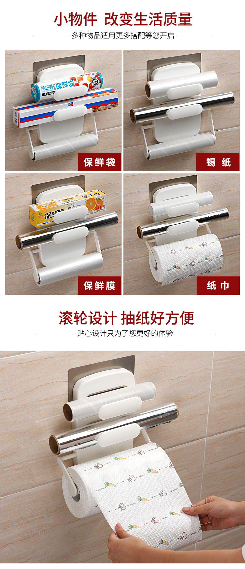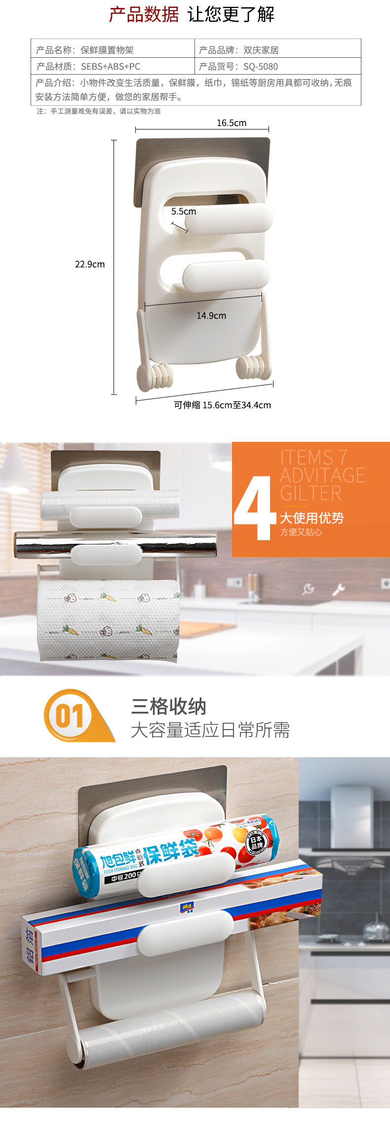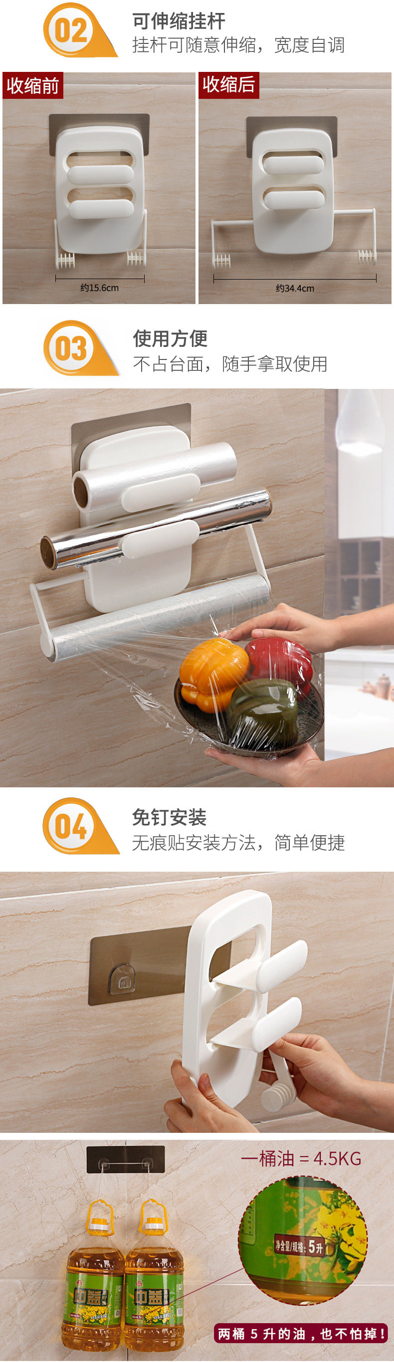 可放置1卷筒形纸巾 或保鲜膜,依据纸巾长度可自由调节纸巾架的宽度,适用于15~34cm宽的筒形卷纸。免打孔,适用吸附金属材质的表面,如冰箱,不锈钢台柜,瓷砖等【顶部分层设计,可放置保鲜膜】