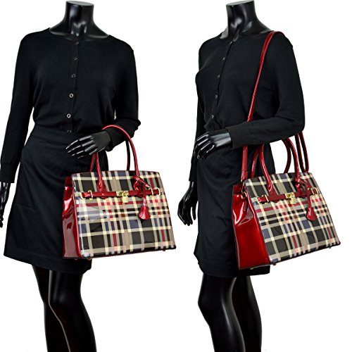 - FEATURE: A padlock decoration on the front face, it's not a functional one.The front and back faces with plaid design. The top handle,shoulder strap, two sides and bottom with matching single color.
