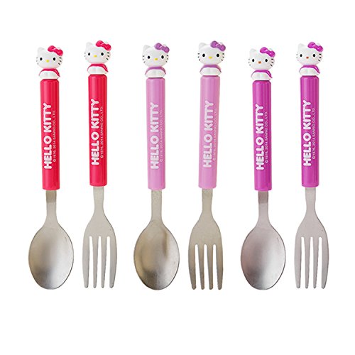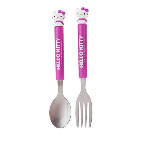 Hello Kitty Spoon & Fork Set : Prime Kitty - 3-Color Set Cute Hello Kitty Spoon & Fork Set - Dark Pink, Lavender, Purple 3-Color Set BPA Free Size Approx: H 6-3/4"x L 3/4" x W 2-3/4" Material: Stainless Steel, PlasticFeature