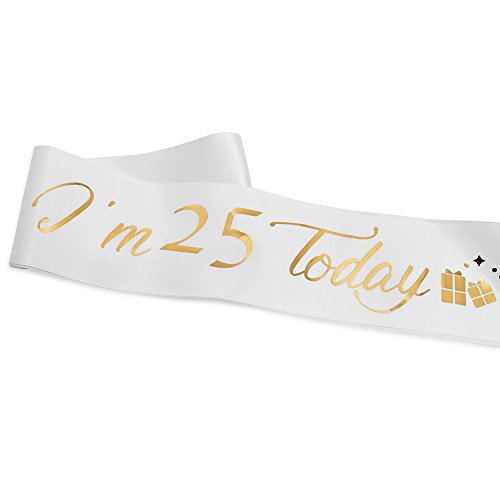 FCAROLYN “I'm 25 Today” - White Satin Sash with Gold Lettering - 25th Birthday Sash Birthday Party Supplies
