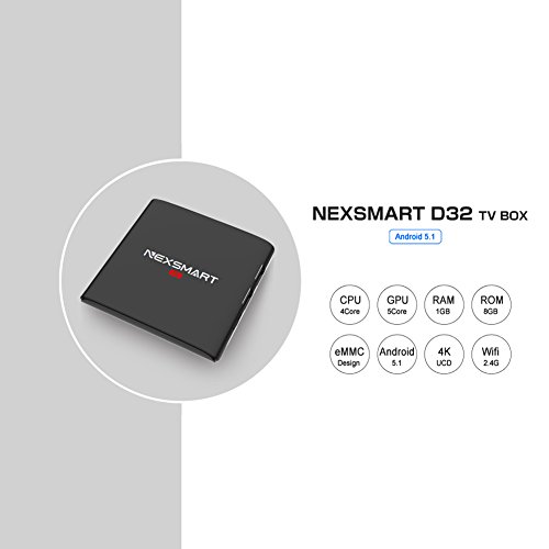 Description: NEXSMART D32 is a small and all- round functional TV box, covered with a unique and elegant appearance. It is combined with Android Lollipop 5.1 operation system, and it comes with the newest Quad-core Cortex A7 1.5GHz 32bit chipset,it can easily turn user's TV into a smart one. Users can watch TV series, movies and sports games at home freely. NEXSMART D32 aims to bring a fun-filled new life to the users. Specifications: Chipset : Quad-core Cortex A7 1.5GHz 32bit GPU: Penta-Core RAM: 1GB DDR3 ROM: 8GB eMMC Flash Power Supply Specifications: Power Supply: DC 5V 2A Power Indicator (LED) : Power ON :Blue sleep: Red Main Features: OS: Android 5.1 3D: Hardward 3D graphics acceleration High Difinition video output : 4K*2K OSD type of languages: English/French/German/Spanish/Italian/ etc multilateral languages LAN: Ethernet:10/100M, standard RJ-45 Wireless: Support 802.11 b/g/n, 2.4G Bluetooth: NA (Bluetooth function available for 2GB RAM version only) Mouse/ Keyboard: Support mouse and keyboard via USB;Support 2.4GHz wireless mouse and keyboard via 2.4GHz USB dongle HDMI: HDMI 2.0 4K*2K 60Hz SPDIF: SPDIF output AVYUV: Support 3G: Support Software Specifications: movies,etc Other feature: Free Internet searching,thousands of android applications,many kinds of games,etc. Accessory: 1 * D32 TV Box 1 * Power Adapter 1 * Remote Control 1 * User Manual 1 * HDMI Cable 0