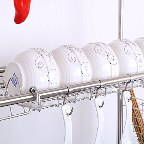 - ALL-IN-ONE VERSATILE ORGANIZER: Can store,forks,spoons,chopsticks, mug ,glass, knife,Chopping board,bowls and other dishes Kitchen rack, 8 removable hooks and two tiered rack provides more space without costing more counter top space making it very convenient.