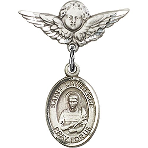 -. Title : Sterling Silver Baby Badge with St. Lawrence Charm and Angel w/Wings Badge Pin 7/8 X 3/4 inches