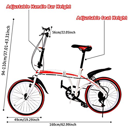 100% Brande New and High Quality!>>>Specification: Material: Carbon Steel Color: Red Length: 160cm Tire Diameter: 49cm Seat Height: 67-90cm Weight Capacity: 85kgBrake: Alloy V Brake Brake Levers: Half Alloy Brake LeverPedals: Folder Pedal. Plastic Saddle: PVC Black Seat Post: STEEL CP Kickstand: Side Kickstand Folding Frame, Folds In Simple Steps Front And Rear Tail Fenders No Need To Assemble Adjustable Seat Height Adjustable Handle Bar Height A Comfortable Ride For Everyday Use Package Content: 1 x Bicycle >>>Note: Due to the difference between different monitors, the picture may not reflect the actual color of the item. We guarantee the style is the same as shown in the pictures We assure you that our products are extremely cost-effective, user-friendly, eco-friendly in nature. We wish you would have a happy shopping experience with us! 0