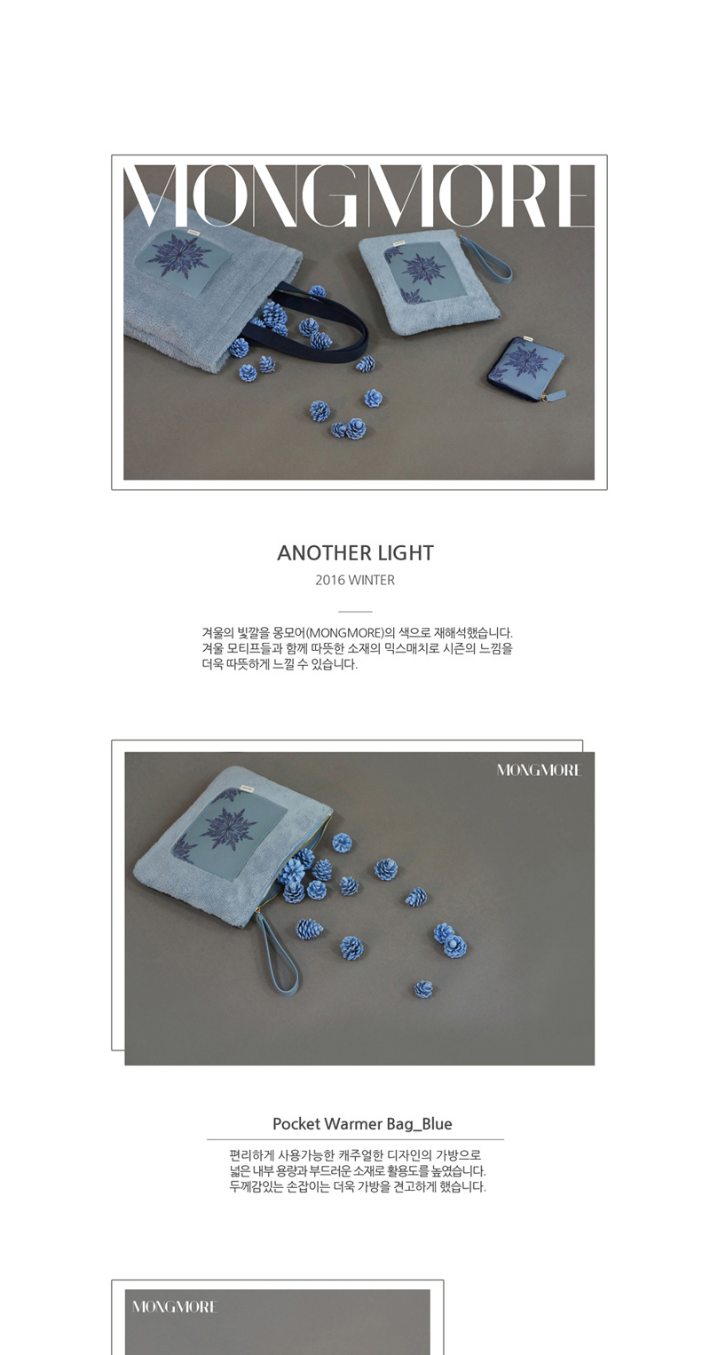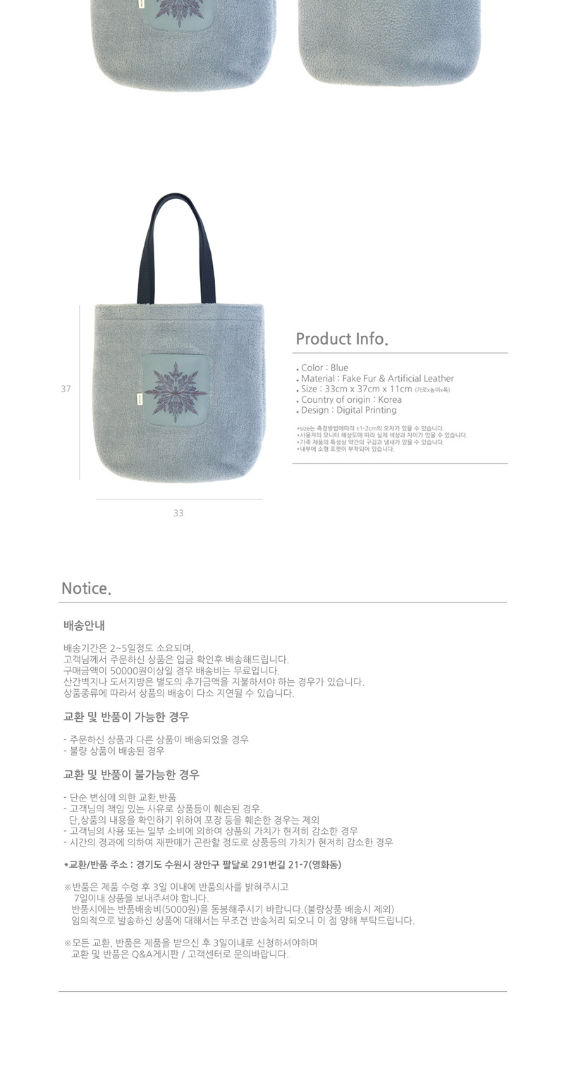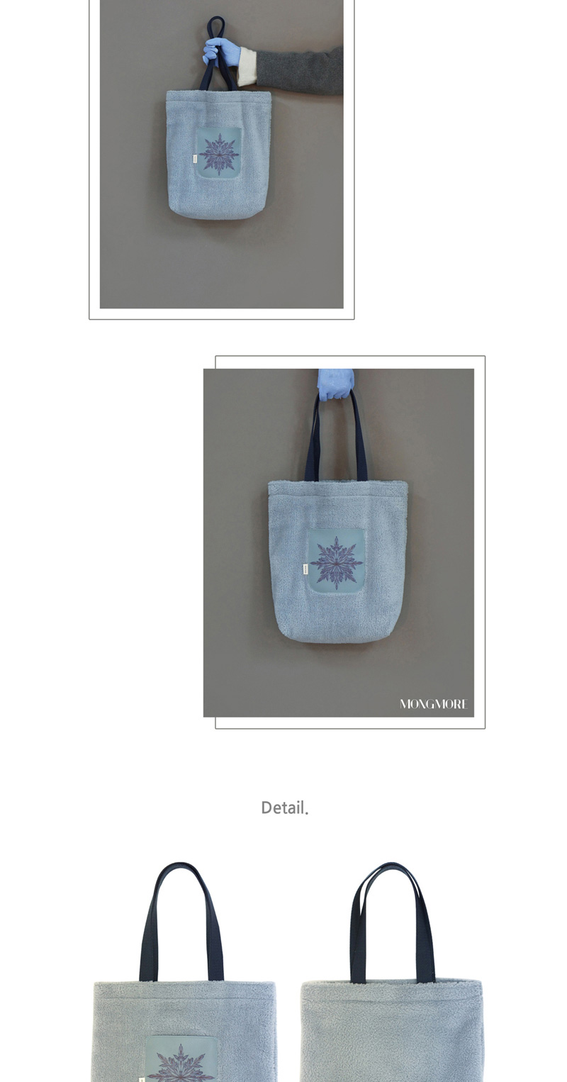 - 주문시 유의사항 : 배송기간은 2~5일정도 소요되며, 고객님께서 주문하신 상품은 입금 확인 후 배송해드립니다. 구매금액이 50000원 이상일 경우 배송비는 무료입니다. 산간벽지나 도서지방은 별도의 추가금액을 지불하셔야 하는 경우가 있습니다. 상품종류에 따라서 상품의 배송이 다소 지연될 수 있습니다. 겨울의 빛깔을 몽모어의 색으로 재해석했습니다. 겨울 모티프들과 함께 따뜻한 소재의 믹스매치로 시즌의 느낌을 더욱 따뜻하게 느낄 수 있습니다. 편리하게 사용가능한 캐주얼한 디자인의 가방으로 넓은 내부 용량과 부드러운 소재로 활용도를 높였습니다. 두께감있는 손잡이로 가방을 더욱 견고하게 했습니다.