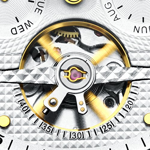 -. Feature : IPG plating stainless steel case+ mineral glass / Multifunctional automatic mechanical movement+ Visual rear cover / Italy genuine leather band / Water resistant: 3ATM / Functions displayed: time / date /week /month