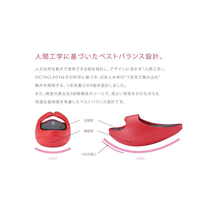 ○인간공학에 기초한 베스트 밸런스 설계. 사람이 자연스러운 움직임에 사용 할 수 있는물을 설계하고, 디자인에 살린다「인간공학」.VICYACLADY는 그 과학에 기초하고, 일본인 본래의“발끝에 들여놓는다”동작이 재현한다,발끝 중심의 R면을 설계했습니다.또한 경도가 다른 2단계 구조의 솔에,적당한 부하를 걸(걸치)면서도 쾌적한 사용감을 고려한 베스트 밸런스 설계입니다.