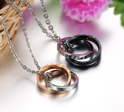 원본상품명: 【ノ?ブランド品】ステンレス製 ペアネックレス 刻印 「 ETERNAL LOVE ( 永遠の愛 )」 2連リング ネックレス キュ?ビックジルコニア CZダイヤ 使用 メンズ ブラック & レディ?