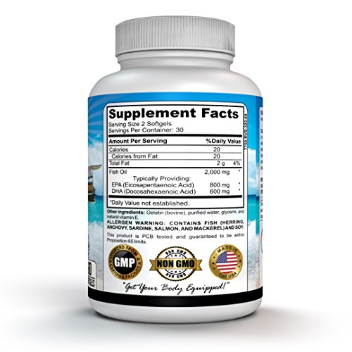 Omega-3 Nutritional Supplements, Omega 3 Nutritional Supplements, Omega-3 Fish Oil, Omega 3 Fish Oil, Omega-3 Fish Oil 2000mg 60 burpless softgels Active Total Omega-3 1400mg Triple Strength EPA 800mg and DHA 600mg. Omega-3 fish oil contains both docosahexaenoic acid (DHA) and eicosapentaenoic acid (EPA).