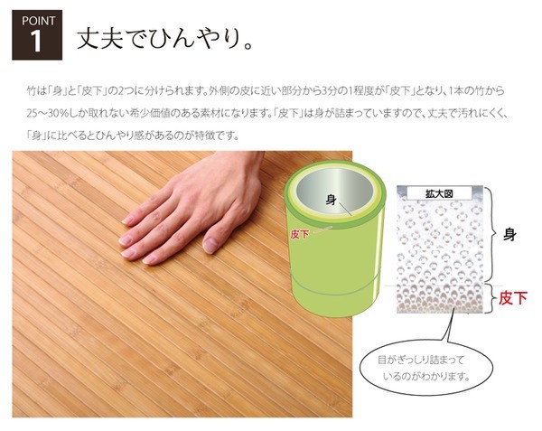 孟宗竹の表面付近の目がぎっしり詰まった部分のみを使用した竹ラグです。表面部分は特に汚れにくく耐久性に優れ、熱伝導率が高いため、ひんやり感も抜群です。表面の肌触りを滑らかにするため、また竹の色を揃えるためにUV塗装を施しています。また無垢材を使用し、あたたかみのある質感に仕上げました。スモークすることで色を出しています。染料、顔料は使用していません。シンプルな糸無しの張り付けタイプです。素材は皮下17mm幅の竹ヒゴを使用しています。17mmの竹ヒゴは大きく育った竹からしか取れない素材です。竹は他の木材と比べると格段に成長が早く(3~5年で成竹)、持続的生産が可能な環境に優しいサスティナブルな素材です。