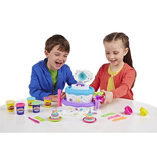 Play-Doh Plus compound is softer and smoother for realistic decorations; Includes base, bottom cake tier, cake machine with cake stand, 6 sticks,