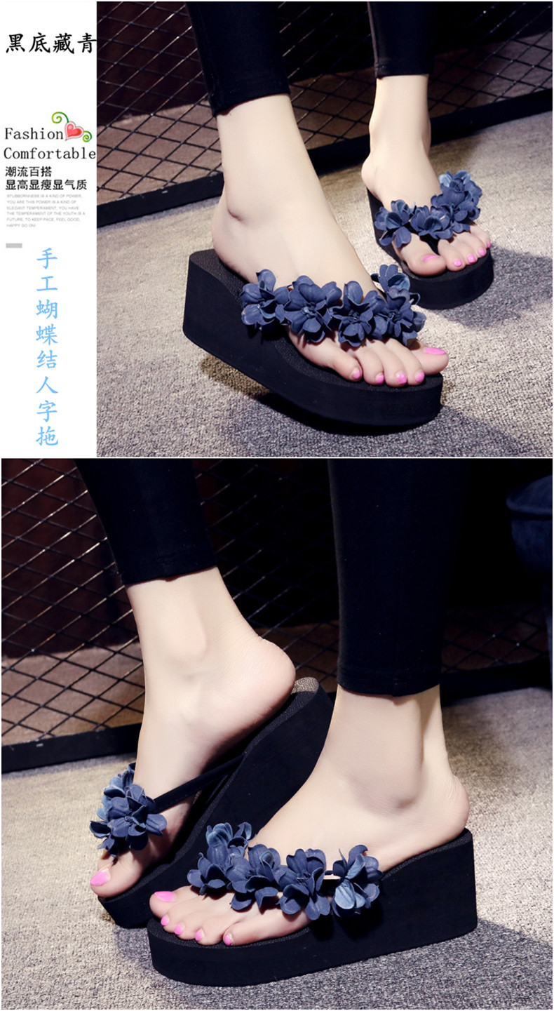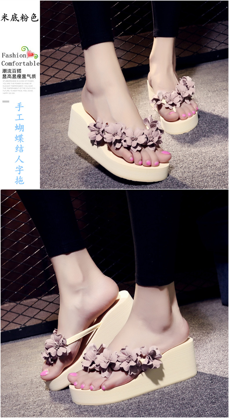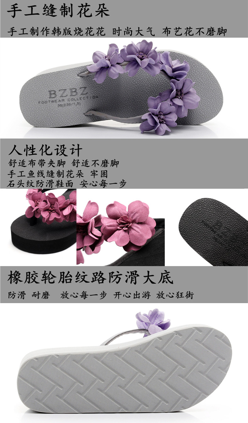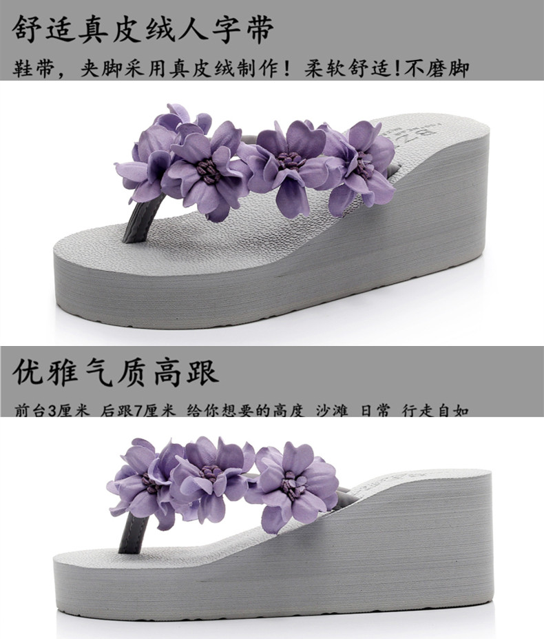 手工缝制甜美花朵沙滩鞋外穿时尚厚底防滑凉拖女夏韩版高跟人字拖