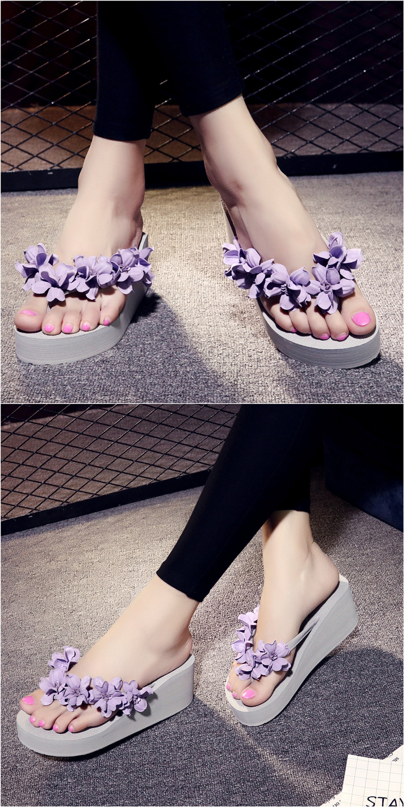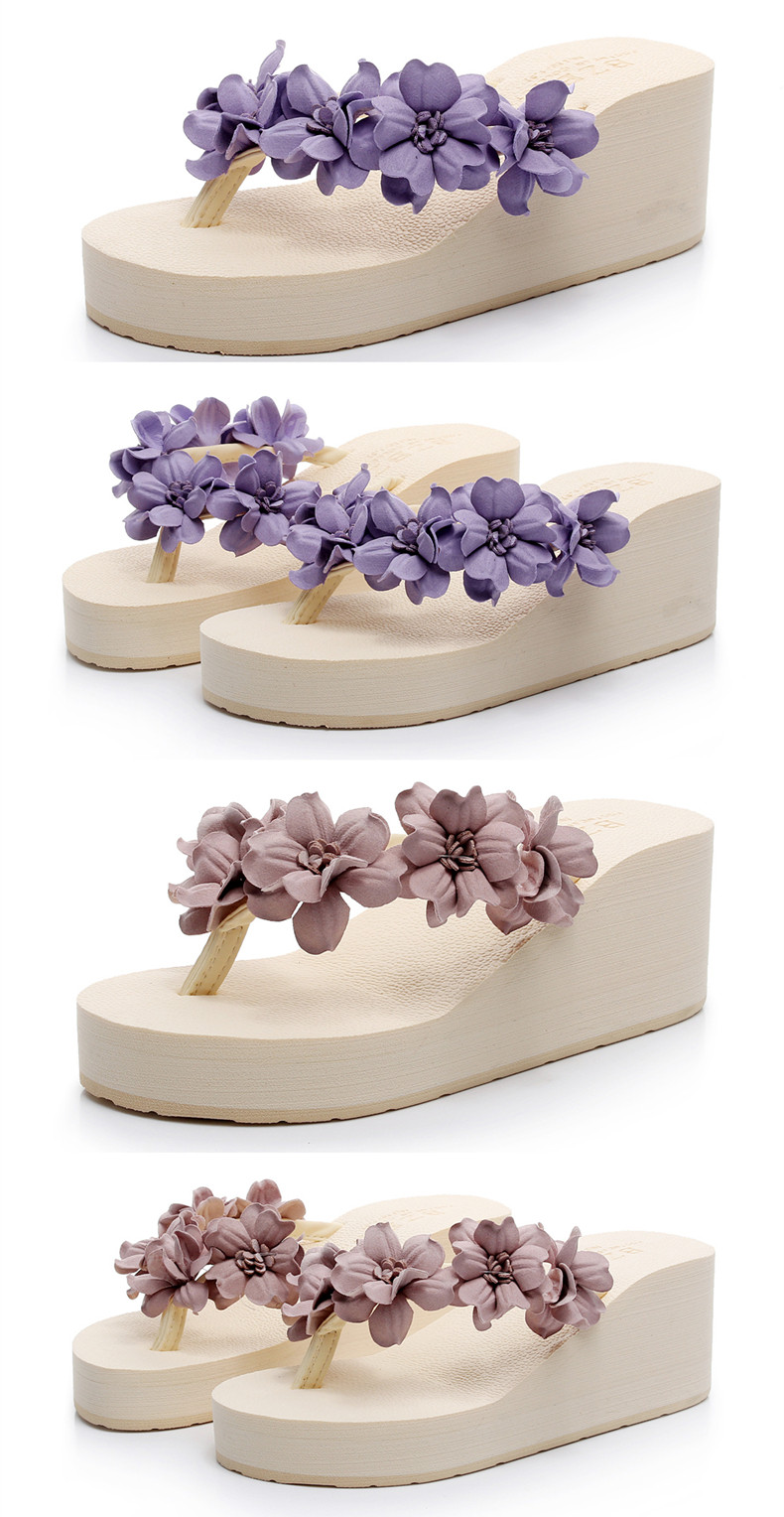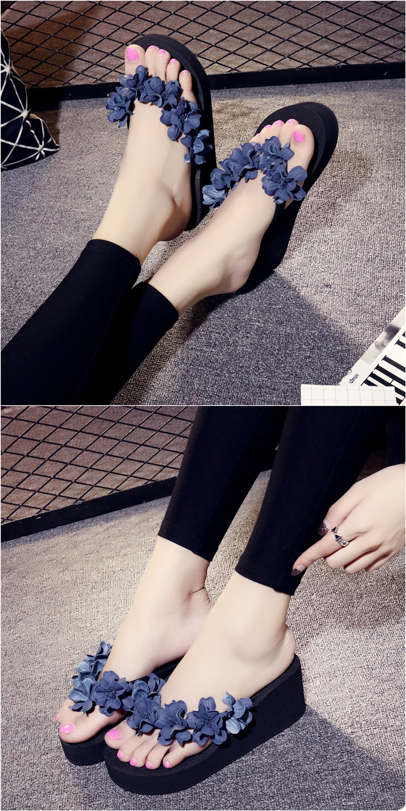 手工缝制甜美花朵沙滩鞋外穿时尚厚底防滑凉拖女夏韩版高跟人字拖