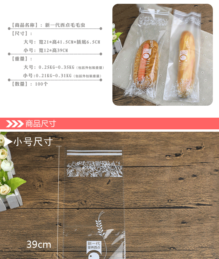 毛毛虫面包袋 长条齐口营养袋西点饼干袋100个 烘焙包装