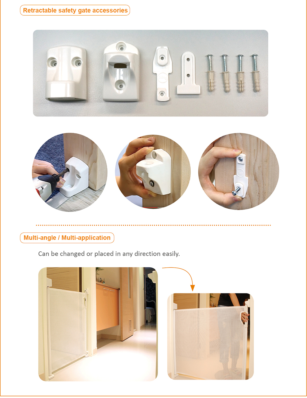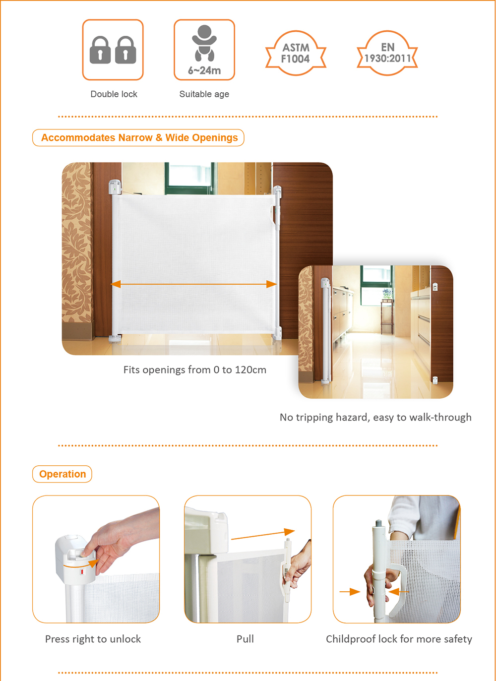 Compact & light, space saving with portable design. Can be operated during about 8~12 sec,of the timer with “fixed function”. No need to retract the gate when walking through every time. Very convenient and user-friendly. No tripping hazard, easy to walk-through. Can easily be transported to another location. Can be used in either doorways or stairs. Fits openings from 0 to 120cm.