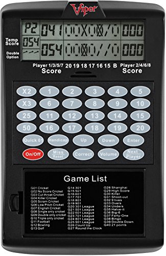 - Feature : Brings all of the exciting games you find with electronic dartboards, and makes them available for steel tip dartboards / Features a large, LCD monitor that can easily be seen from the throw line / Fun for up to 8 players, with 40 games to choose from and 655 game options, including setting custom handicaps / Designed with an auto-off mode and a sleep mode to help save battery power; The soft keypad allows for clear and easy operation / Measuring 5" L x 1.5" W x 7.5" H, the Viper DigiScore is battery operated, which requires 3 AA batteries (not included)