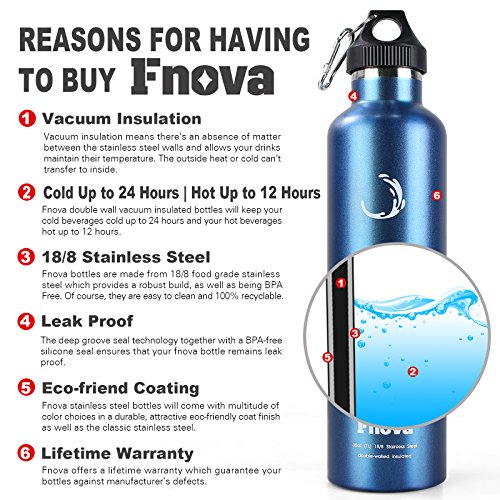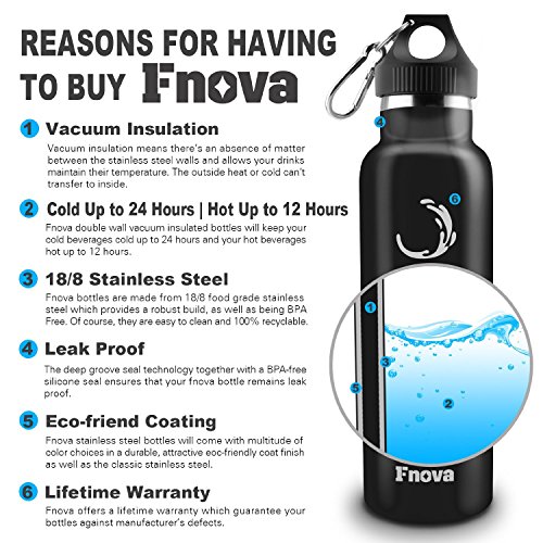 Studio : Fnova Publisher : Fnova Product Description A good day may be spoiled by unpleasant smell and cold beverages in Plastic Bottle or Single Walled Metal Bottle. Finally, your searching for the perfect insulated water bottles is end! Fnova Insulated Stainless Steel Water Bottle are the best companion you've been waiting for: - Double Wall Insulated Vacuum Seal keeps cold 24 hrs | hot12 hrs - Premium, Lightweight, BPA-Free Stainless Steel Body can withstand intense impacts - Three Innovative Drinking Caps allows you switch up your drinking style whatever you are doing Keeps Cold 24 hrs | Hot12 hrs Unlike plastic water bottles or single wall stainless bottles, Fnova double wall insulated water bottle will keep your beverage of choice in cold for a whole day and hot for the most day. Health: BPA-Free Manufactured from superior BPA-Free stainless steel, Fnova Water Bottle is built to last, and unlike cheap plastic sports bottles, won't leech chemicals or toxins into your drink, for safe reuse! Convenience: 3 Interchangeable Caps Fnova Water Bottle is bundled with 3 innovative convenient caps: Sports Cap for quick drinking without opening the bottle; Loop Cap with carabineer offers convenient, easily access hydration while outdoor; Steel Bamboo Cap is attractive and eye catching that will perfectly fit your office or workweek routine! Dry-Touch: No Leak No Sweating The Fnova power-coated matte finish exterior will not only improves the bottle's grip and feel, but also cause no sweating even in the most humid environments. No more puddle or drips on your desk or shirt!