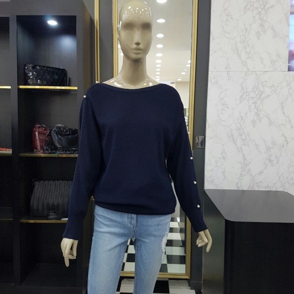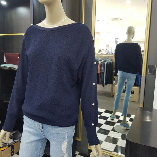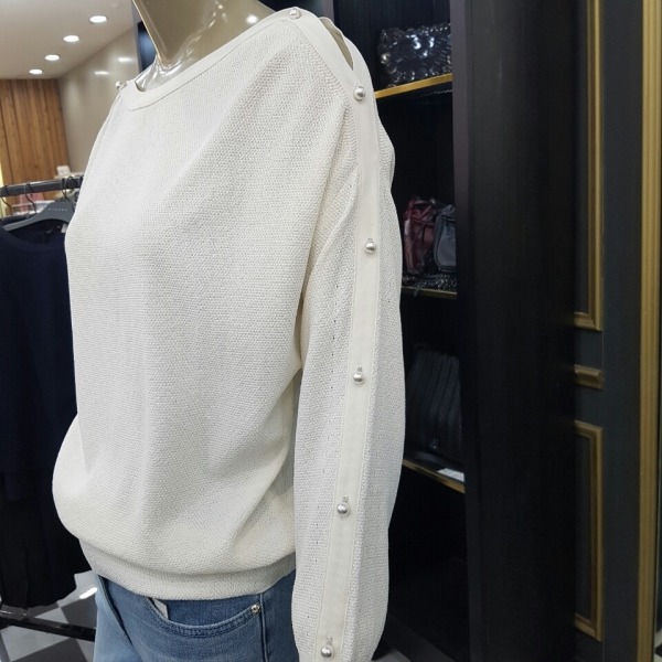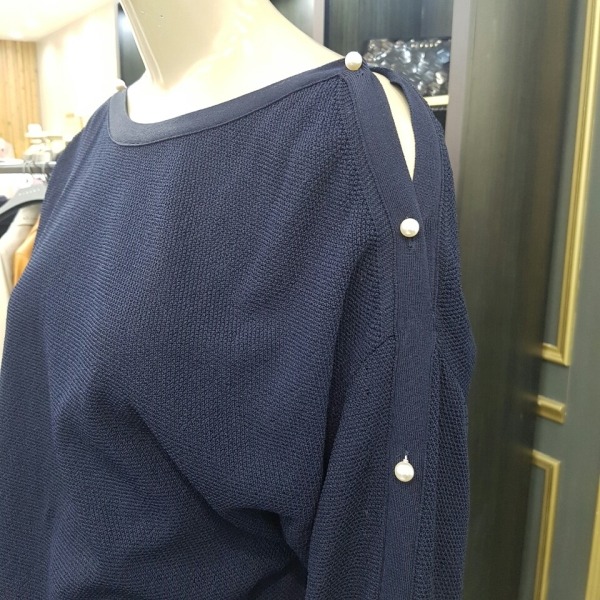 왼쪽어깨 한쪽만 귀엽게 살짝 오픈돼있으며 소매라인따라 진주장식