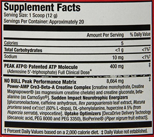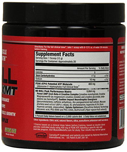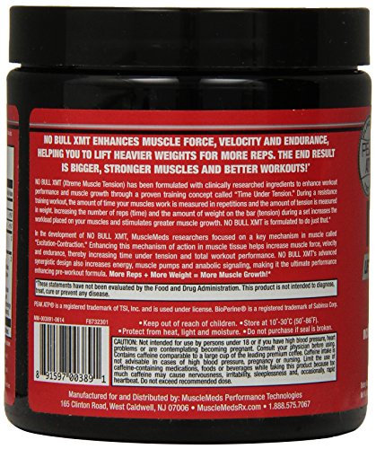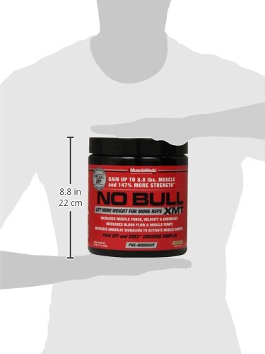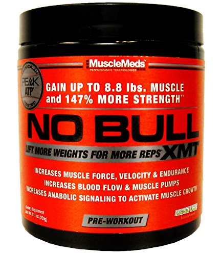 ReleaseDate : 2014-06-04 Studio : MuscleMeds Publisher : MuscleMeds Binding : Health and Beauty Product Description NO BULL XMT Pre-Workout Formula enhances muscle force, velocity and endurance allowing you to lift heavier weights for more reps. The end result is Bigger, Stronger Muscles and Better Workouts! NO BULL XMT (Extreme Muscle Tension) has been formulated with clinically researched ingredients to enhance workout performance and muscle growth through a proven training concept called "Time Under Tension." During a resistance weight training workout, the amount of time your muscles work is measured in repetitions and the amount of tension is measured in weight. Increasing the numbers of reps (time) and the amount of weight on the bar (tension) during a set increases the workload placed on your muscles and stimulates maximum muscle growth. NO BULL XMT is formulated to do just that - More Reps More Weight= More Muscle Growth. In the development of NO BULL XMT, MuscleMeds researchers focused on a key mechanism in muscle coined "Excitation-Contraction." Enhancing this mechanism of action in muscle tissue helps increase muscle force, velocity and endurance thereby increasing "Time Under Tension" and total workout performance. In addition to enhancing muscle "Excitation-Contraction," NO BULL XMT's advanced synergistic design also increases energy, muscle pumps and anabolic signaling, making it the ultimate performance enhancing pre-workout formula. NO BULL XMT is the Pre-Workout Formula for those who want more. More Reps More Weight = More Muscle Growth! 0
