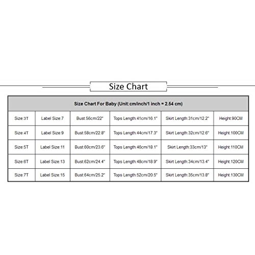 Size:3 years old Label Size:7 Bust:56cm/22" Tops Length:41cm/16.1" Skirt Length:31cm/12.2" Height:90CM Size:4 years old Label Size:9 Bust:58cm/22.8" Tops Length:44cm/17.3" Skirt Length:32cm/12.6" Height:100CM Size:5 years old Label Size:11 Bust:60cm/23.6" Tops Length:46cm/18.1" Skirt Length:33cm/13" Height:110CM Size:6 years old Label Size:13 Bust:62cm/24.4" Tops Length:48cm/18.9" Skirt Length:34cm/13.4" Height:120CM Size:7 years old Label Size:15 Bust:64cm/25.2" Tops Length:52cm/20.5" Skirt Length:35cm/13.8" Height:130CM 0