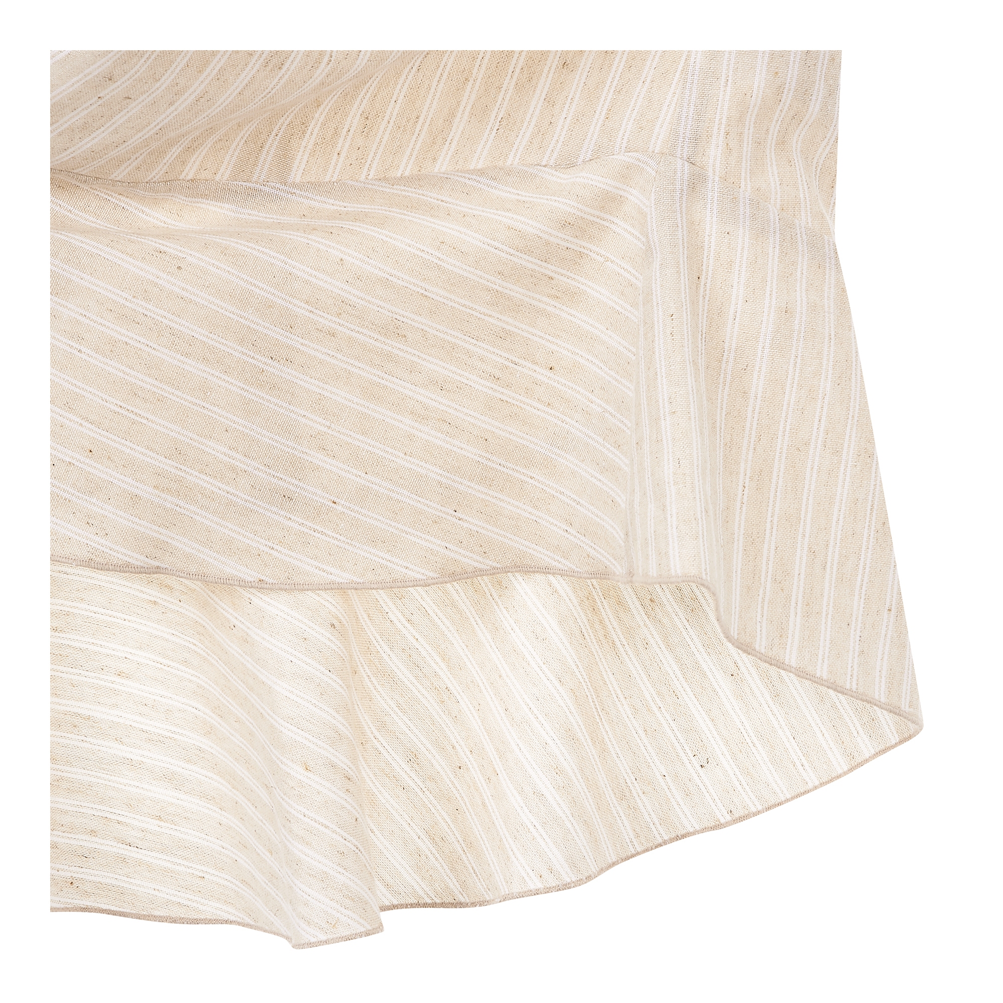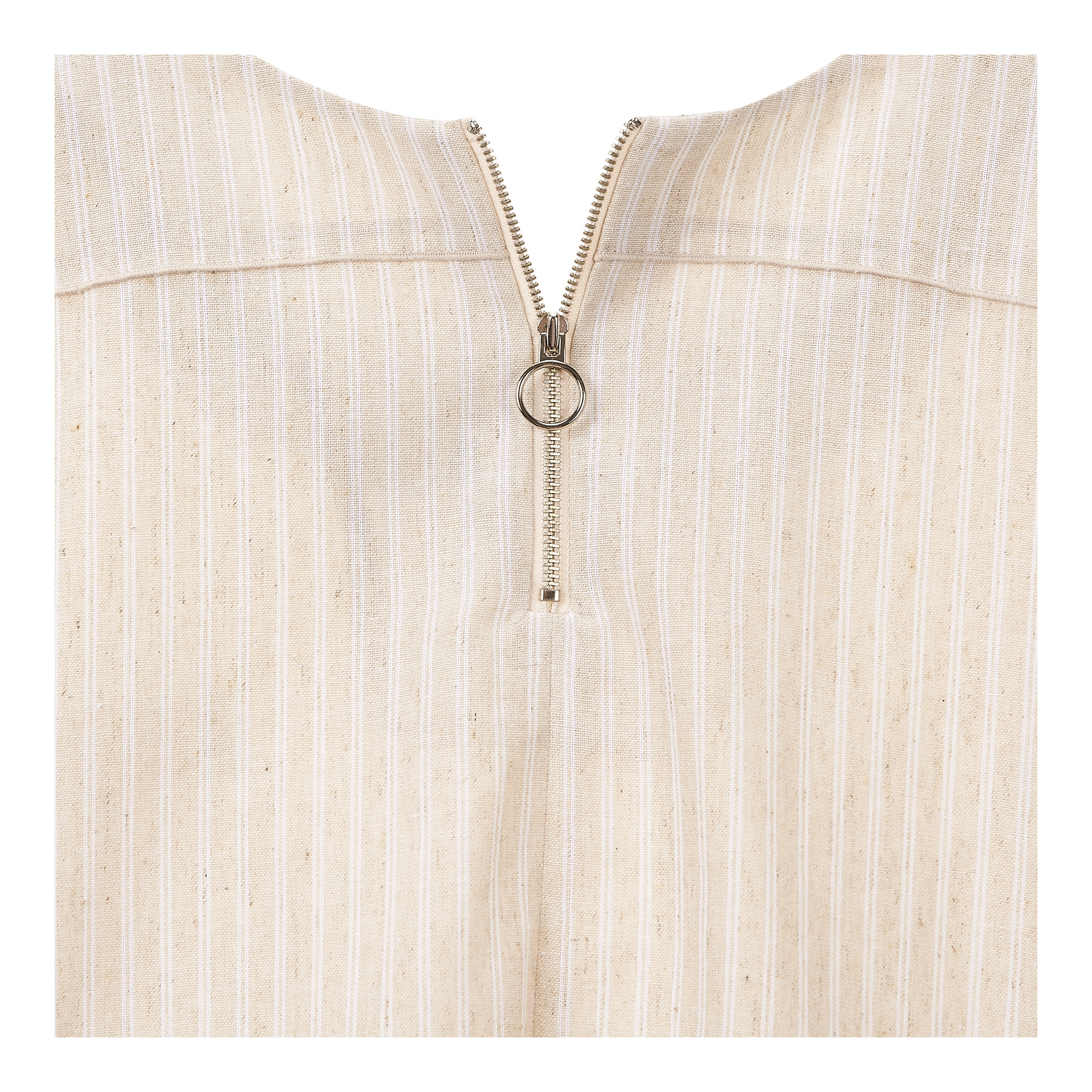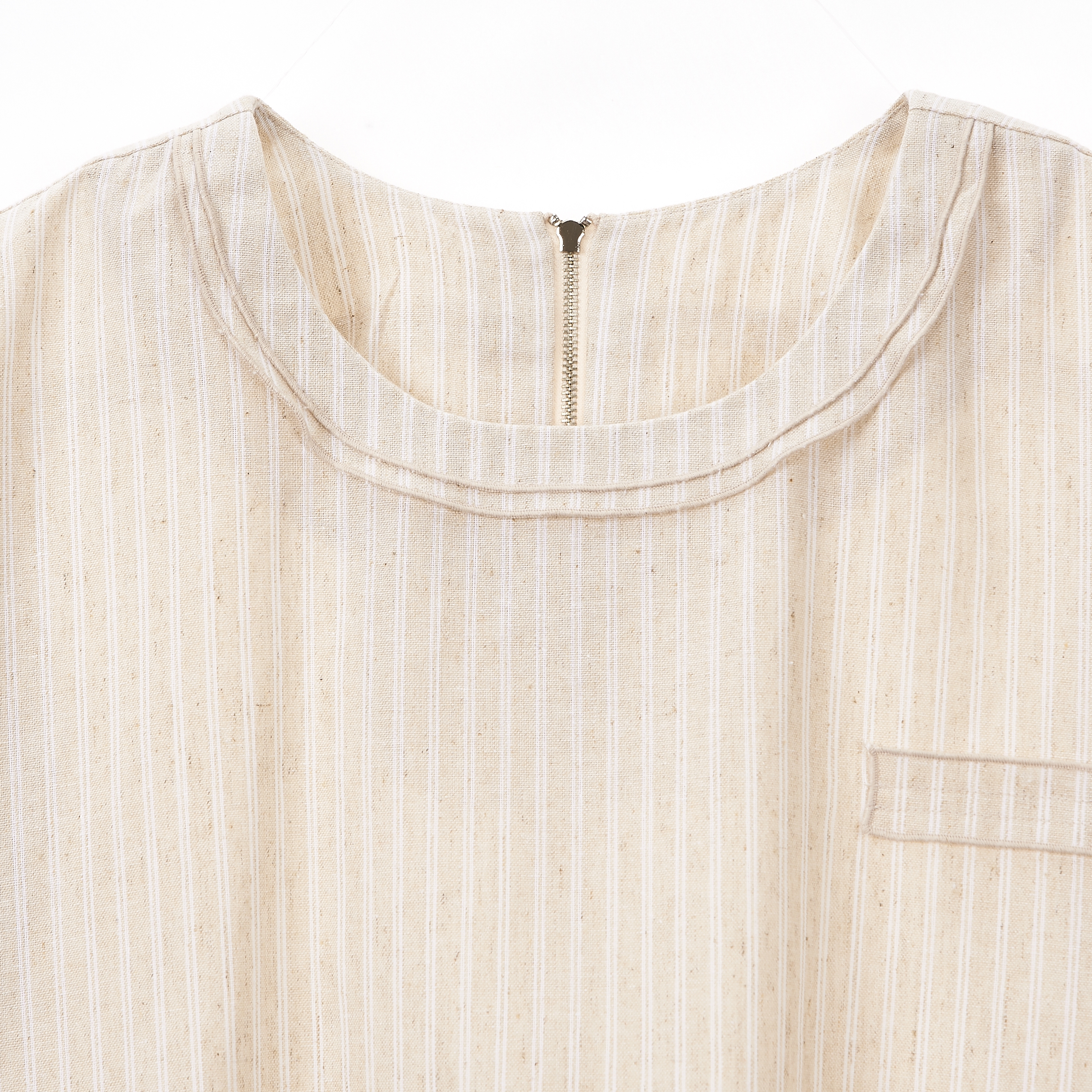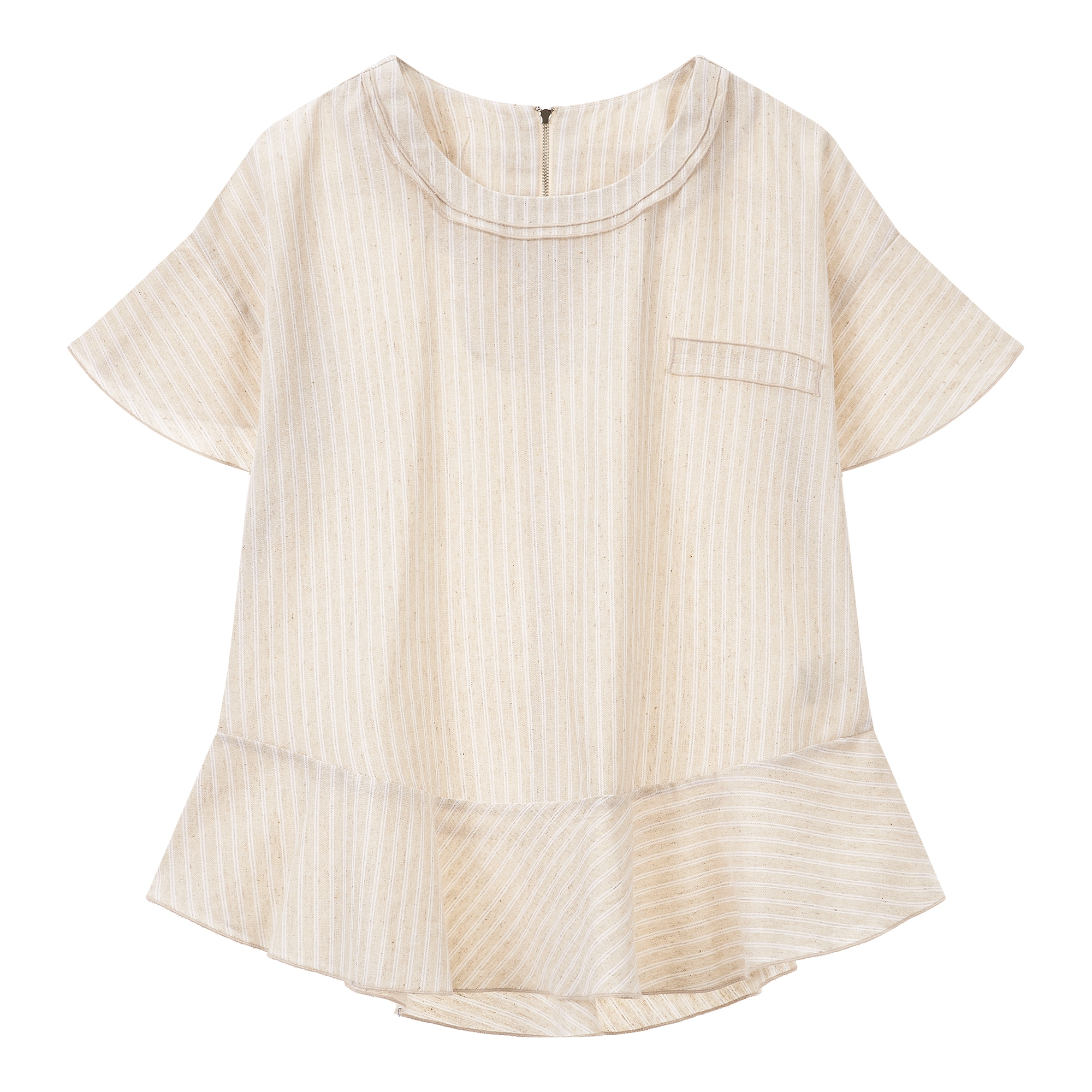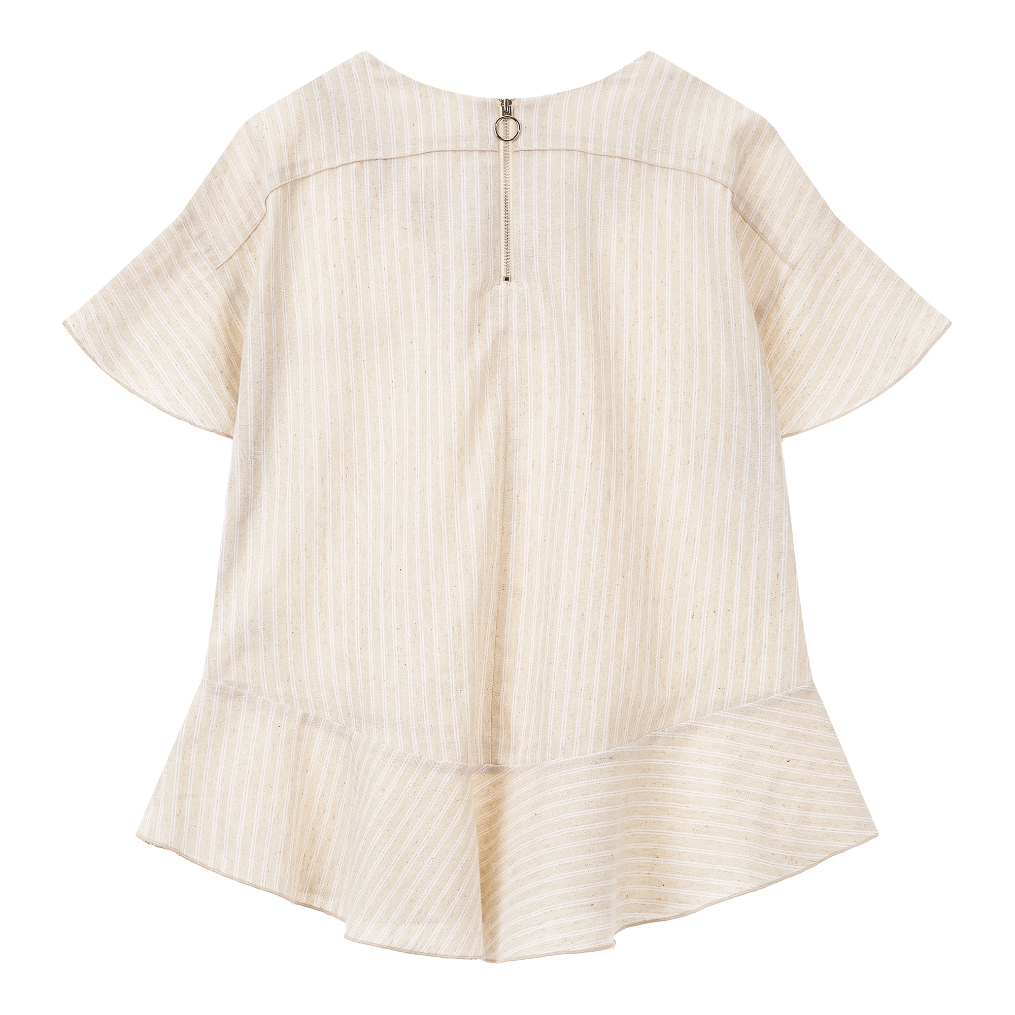 컬렉션 : 2018 Spring/Summer 디자인 포인트 : - 스트라이프 패턴 디테일이 돋보이는 캐주얼한 무드의 린넨 혼방 블라우스- 밑단 러플 디테일로 포인트를 준 트렌디한 디자인- 센터백 지퍼 클로징 디테일이 있어 착용이 간편한 아이템 스타일링 추천 : 다양한 워싱의 스키니진 혹은 슬랙스 팬츠와 트렌디한 스타일링을 할 수 있음