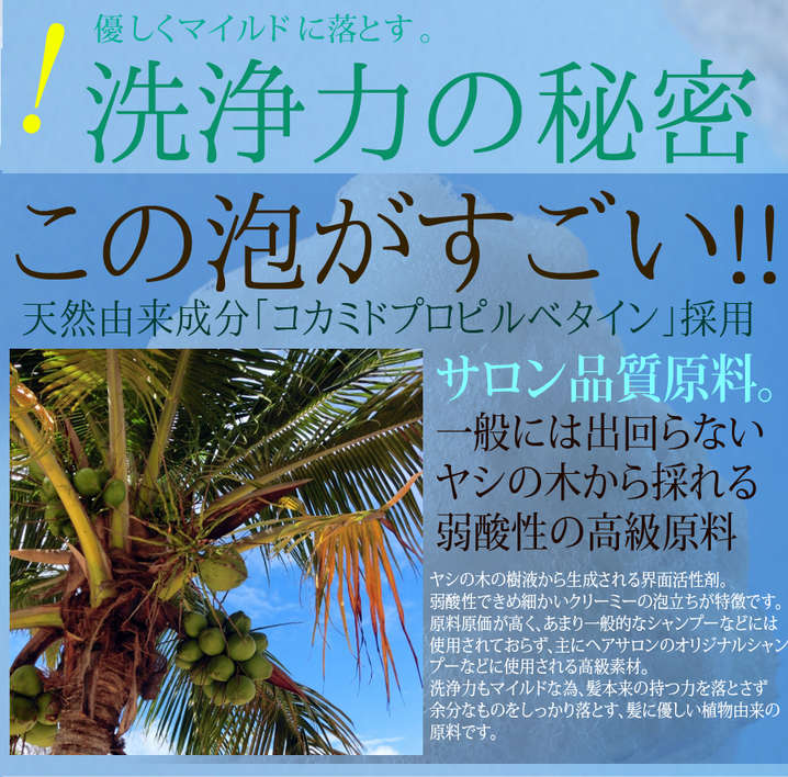 ●成分:水、コカミドプロピルベタイン、ココイルグルタミン酸2Na、グリセリン、コカミドメチルMEA、ココイルグリシンK、ココイルサルコシンNa、ヤシ脂肪酸K、ブロッコリー種子油、オレンジラフィー油、クラドシホンノバエカレドニアエ多糖体、マカデミア種子油、ホホバ種子油、アーモンド油、ツバキ種子油、ブドウ種子油、アボカド油、メドウフォーム油、ヘーゼルナッツ油、月見草油、コメ胚芽油、シア脂、カニナバラ果実油、グアーヒドロキシプロピルトリモニウムクロリド、ポリクオタニウム-10、ジオレイン酸PEG-120メチルグルコース、ポリソルベート80、PEG-2カプリリルアミン、クエン酸、メチルイソチアゾリノン、プロパンジオール、香料