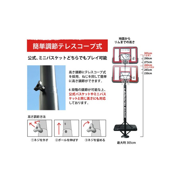 높이2.3?3.05m까지 조절 가능한 telescope식 폴을 채용,6단계의 높이 조절이 가능한 상,일반적인 농구부터 미니 농구와 같은 높이까지 폭넓은 높이로 대응합니다.