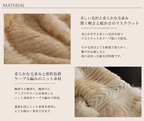 -. Feature : マスクラット&シルバーフォックスの暖かくて可愛らしい七分袖コート。 暖かなニット素材に、驚く程に柔らかくて軽いマスクラットをテープ使いで使用。 ボリュームたっぷりのシルバーフォックスをアンダーウエストと袖周りに使い、ふわりと華やかな印象に。 お尻が隠れる丈でわずか530gの軽さの七分袖ファーコートです。 / ■サイズ 【M】着丈75cm/胸周り98cm/裄丈72cm 【L】着丈75cm/胸周り102cm/裄丈74cm 【重量】530g 【素材】 毛皮:マスクラット、シルバーフォックス ニット:ウール30%、アンゴラ20%、ナイロン20%、レーヨン15%、テンセル15% 【留め具】スナップボタン×4 【ポケット】表:左右に1ヶ所ずつ 【備考】 ・ニット素材にファーをテープ使いで使用しています。 / 毛皮:マスクラット、シルバーフォックス ニット:ウール30% 、アンゴラ20% 、ナイロン20% 、レーヨン15% 、テンセル15% / ニット素材にファーをテープ使いで使用しています。 / 弊社は記念日、誕生日、就職・昇進、入学・卒業、内祝い・歓迎会・送別会・還暦・退職祝いなどの