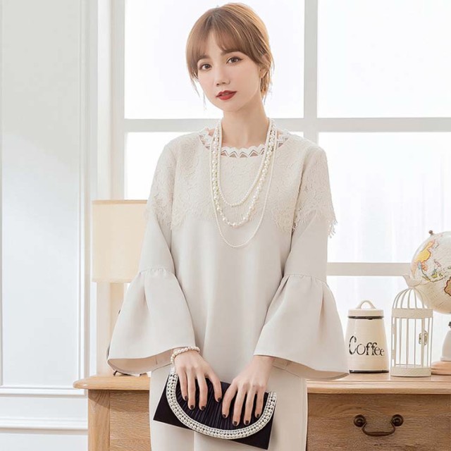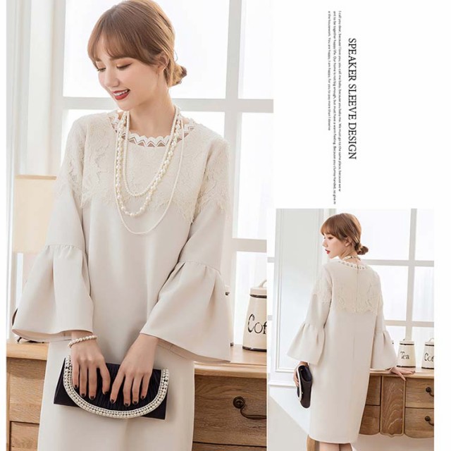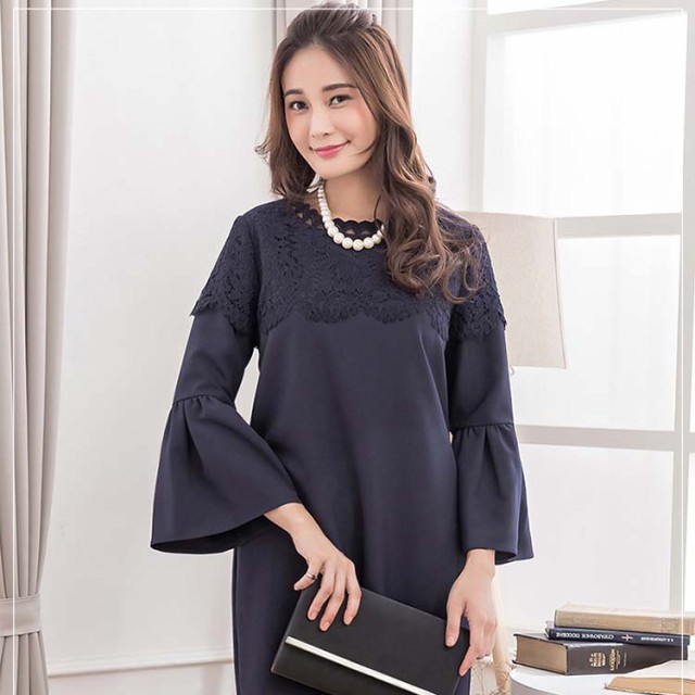 デコルテの繊細レースと、フリル袖がフェミニンなスレンダードレス