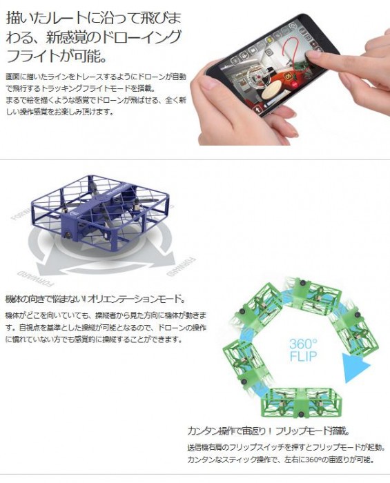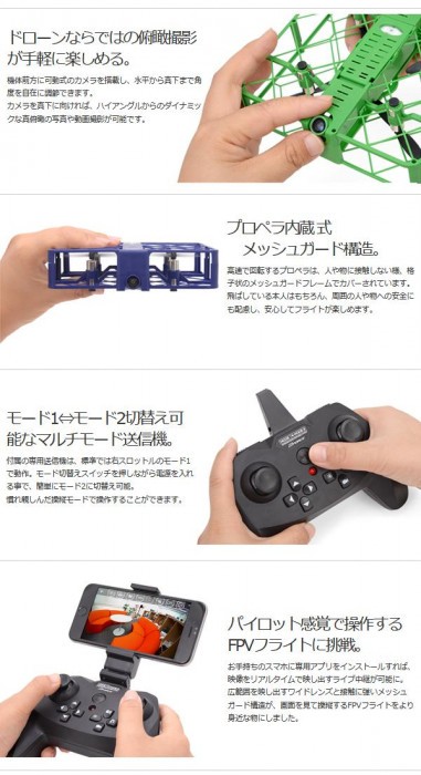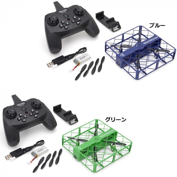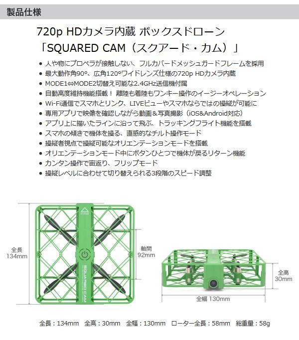 | セット内容 | SQUARED CAM本体 2.4GHz 4ch送信機 スマートフォンホルダー 飛行用LiPoバッテリー 予備プロペラ×4 USB充電ケーブル 日本語取扱説明書 |