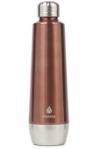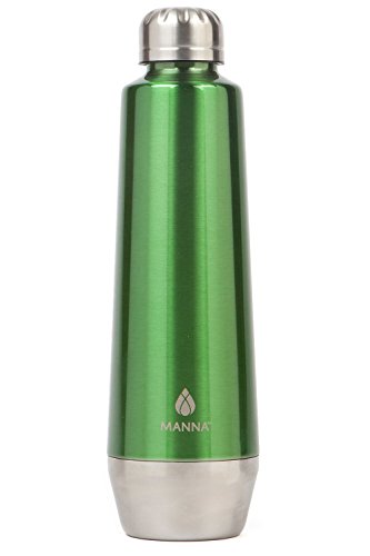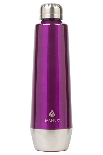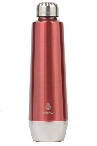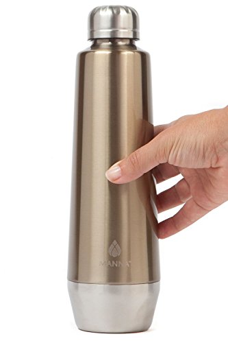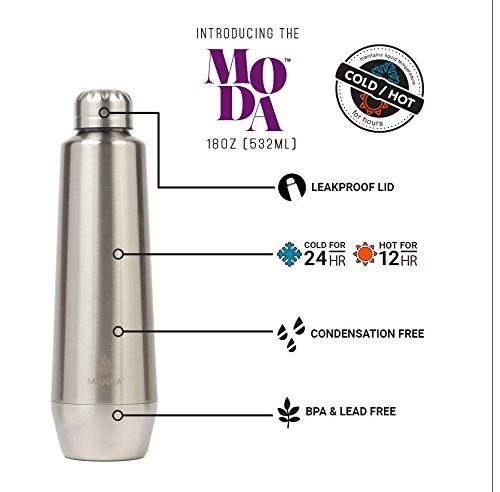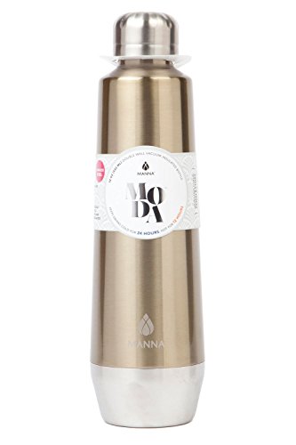 Manna Moda 18 oz Hot & Cold Insulated Bottle. The drinking container features a slick metallic finish and sturdy stainless-steel body.