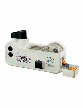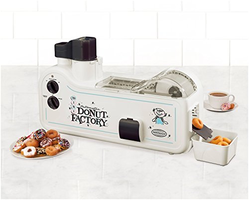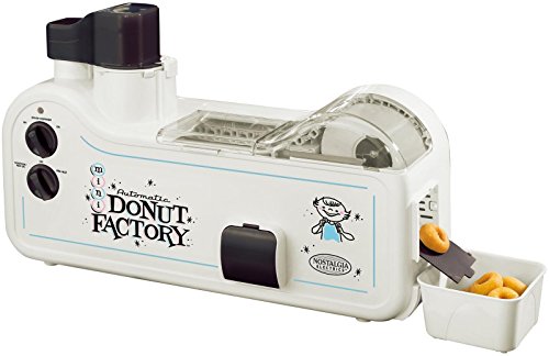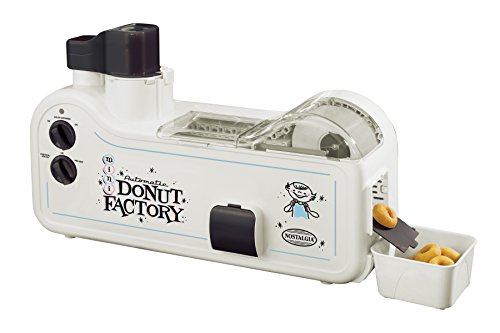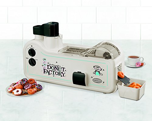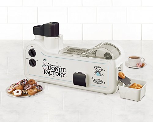 Studio : Emgee Publisher : Emgee Binding : Kitchen Product Description The Nostalgia Electrics MDF200 Automatic Mini Donut Factory allows you to cook hot and tasty mini donuts in your own kitchen! Your family and friends will enjoy watching the donuts form, cook and travel down the donut slide, all within approximately 90 seconds. Great for large parties and ideal for fundraisers, this machine makes easy-to-sell treats for pennies a piece. Just add dough and the Mini Donut Factory does the rest. The enclosed oil fryer keeps cleanup to a minimum. 0