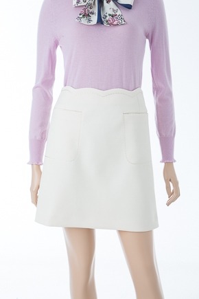 오비 스칼럽 장식으로 여성스러우면서도 귀여운느낌을 살린 스커트. 포켓 자수 장식으로 포인트를 줌.