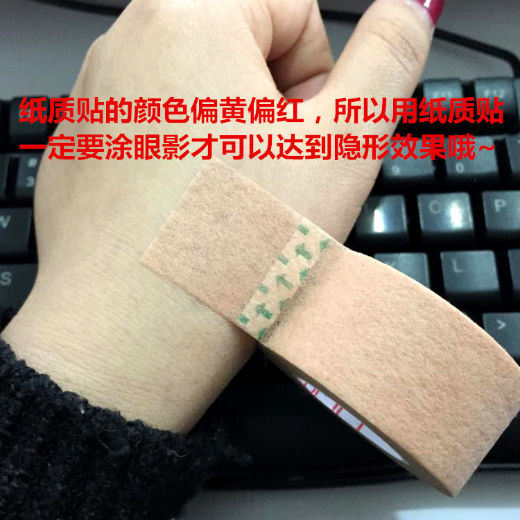我来解答一下:这款是肉色纸质的 根据隐形的原理,制作的非常轻薄透气 而且纸质的不会反光 所以不会轻易的被别人发现 因为是纸质的上妆的上色度比普通的那种要好很多哦,假如涂抹上一层眼影,隐形的效果会更好哦!像拍电视剧的演员 模特都需要用这种的 普通的美目贴相信大家都用过 特点就是反光 上妆不上色 厚重使眼皮比较难受 容易被发现~所以亲爱的MM们都可以尝试下本款隐形美目贴哦!一分钱一分货!效果好坏咱们用买家的评价作证明。