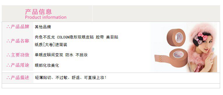 明星们用的就是此款肉系隐形遮瑕双眼皮贴(美目贴)!我们普通用的双眼皮贴是白色的,贴上去比较明显!这款就不会哦!纸质的超自然效果!眼影眼线照画!明星剧组专用!美丽完美的要求者力推本款!