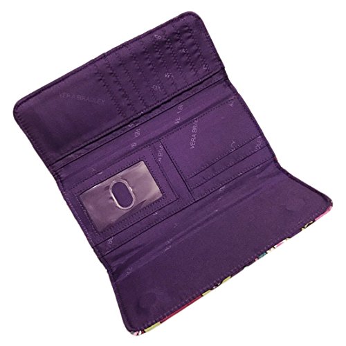 Vera Bradley's spacious Trifold Wallet is made of soft quilted fabric on the outside with a coordinating solid custom print logo fabric on the interiors. The interior features 11 card slots, 3 full length bill compartments and a clear ID window. The trifold style secures with two hidden magnet closures. The back offers an gusset zippered compartment. It measures approximately 8.5 inches (L) x 4.25 inches (H) x 1 inch (W). The location of pattern varies with each wallet. Spot clean with a damp cloth and mild soap.Feature