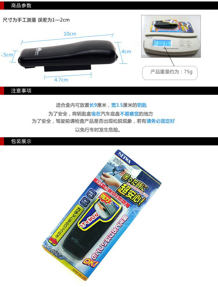 Japanese car exports to share black box body and chassis of the vehicle color consistent, easy to be found, a strong magnet design, bumpy road in the car will not fall off, ly sealed locking design, making the key box also skills required to open. Box can be placed 8.5 cm long, 4 cm wide keys with a soft sponge inside bottom, protect key will not be damaged. This produced by Seiwa Japan, one of the Big Three auto supplies brands (SD) company, delicate appearance and exquisite workmanship, exquisite shape, called a model of quality in the industry, is definitely the most practical car that you intimate equipment.