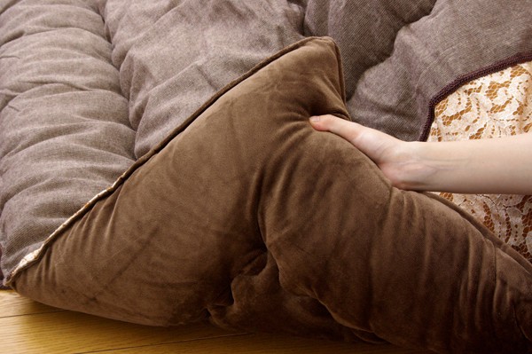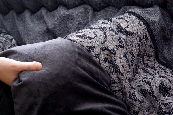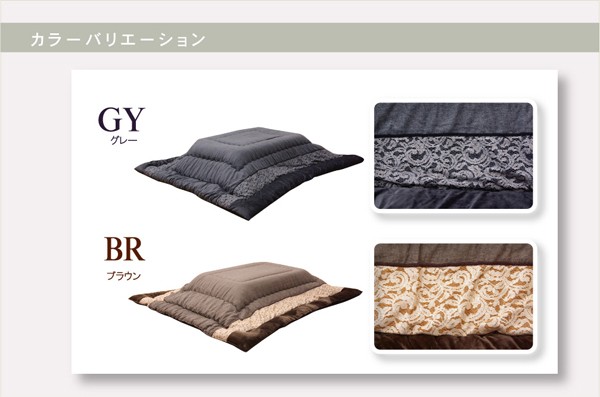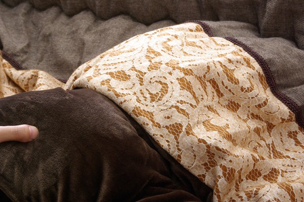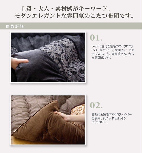 上質、大人、素材感をキーワードにコタツ布団をつくりました。カラーはモノトーンを中心に、深みのあるシックなカラーでまとめております。素材にこだわった上質の生地にレースを使用することでモード感のある大人の雰囲気に仕上げました。肌に直接触れる裏地には肌触りのよい、短毛のマイクロファイバーを使用しています。部分暖房のこたつは電気代もお得です。