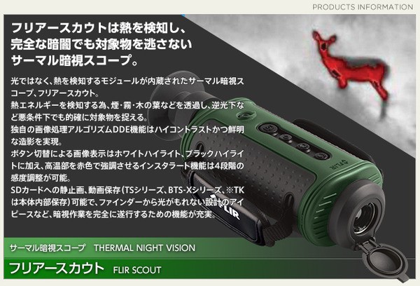 熱を検知し、造影化!光の全く存在しない完全暗闇、煙・薄霧の中、 迷彩柄によるカモフラージュ、一切関係なし!サーマル暗視スコープ、フリアースカウト。 絶対零度(摂氏マイナス273.15℃)以上の熱を持っている物体は全て熱エネルギー(赤外線)を発しています。 フリアースカウトは物体が発している、裸眼では見えない熱エネルギー(赤外線)を検知し、視覚化します。 また、動物の残した足跡にもこの熱エネルギー(赤外線)は反映され、獲物を難なく追跡することができます。