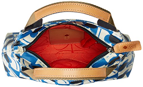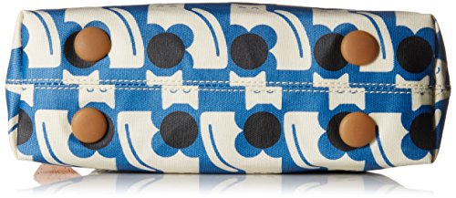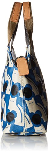 Matte laminated shoulder bag in the 'poppy cat' print with leather trims and double sided webbing handles and contrast colored zip closure. Inside details include linear stem jacquard lining, small leather logo card holder pocket, zip pocket, elasticated key chain and mobile slip pocket. Silver colored hardware. Handles measure 30 cm from top edge of the bag.