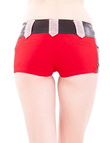 Binding : Apparel Product Description Red Ladies Jeweled Leather Shorts. These shorts features a faux leather banded waistline, thick decorative jeweled belt loops, a two jeweled accent button closure, and a stretchy fit. Colors available in Red, Black, and Blue. Approximately 10" in length, 100% Polyester. 0