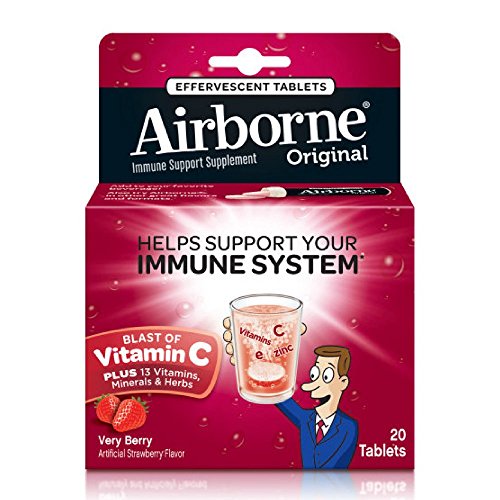 Airborne Effervescent Tablets provide real immune support in a great-tasting and fast absorbing formula. Each serving (1 tablet) delivers a blast of 1000 mg of Vitamin C plus 13 other immune system supporting vitamins, minerals, and herbs, including Echinacea, ginger, and other herbal extracts from whole plant materials. Adults and Children over 12 years old, simply drop 1 tablet in a glass of water or favorite beverage, let dissolve (about 1 minute) and drink. Can repeat every 3-4 hours as necessary. Take up to 3X per day as needed. Gluten Free and No Preservatives. Visit AirborneHealth.com to learn more. These Statements have not been evaluated by the Food and Drug Administration. This product is not intended to diagnose, treat, cure or prevent any disease.Feature