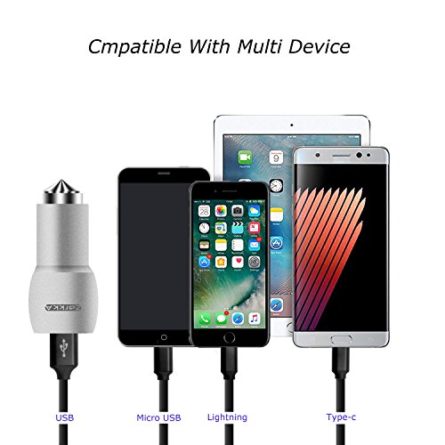 Car Charger + 3-in-1 Charging Cable, ZarkkA Dual Port USB Aluminium Alloy Vehicle Car Charger + 4ft 3-in-1 Multi USB Charging Cord with Type C, Lightning, Micro USB for iphone Android(Silver)